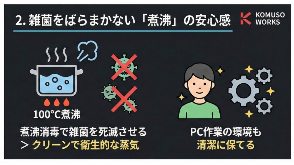 スチーム式は「常に煮沸している」状態なので、放出される蒸気は非常に衛生的。 PC作業で目が疲れたり、喉を傷めやすい環境だからこそ、清潔な潤いは必須ですよね。