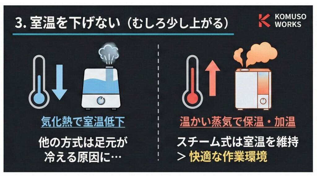 スチーム式は温かい蒸気が出るので、室温を維持、あるいはわずかに上げる効果があります。 「PCの排熱があるから寒くないよ」という方もいらっしゃるかもしれませんが、蒸気による自然な暖かさは、長時間の作業効率を支えてくれる隠れたメリットだと思います。
