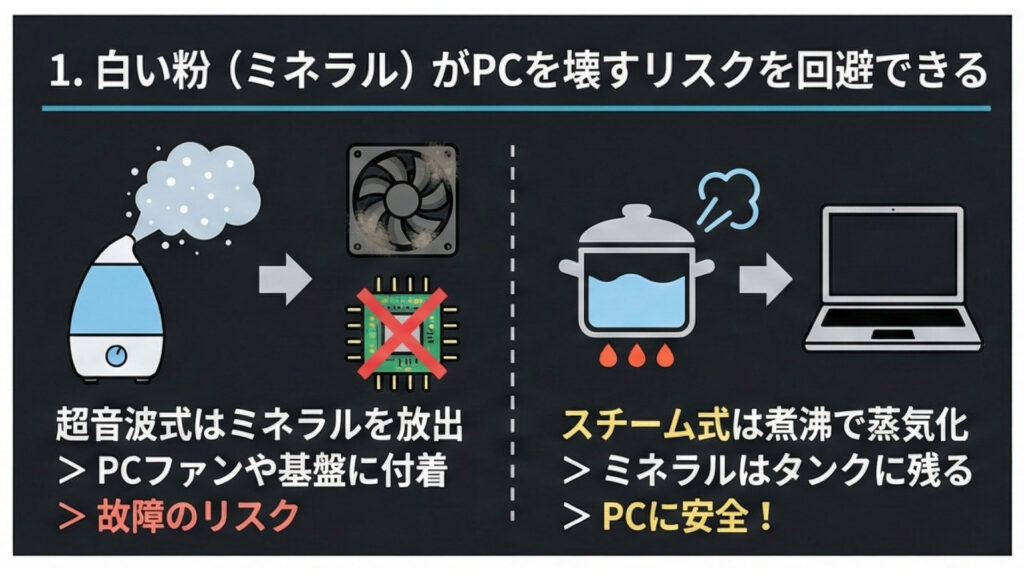 その点、スチーム式は「水を沸騰させて蒸気にする」仕組み。 ミネラル成分はタンク内に残るため、PCに有害な粉を撒き散らす心配がほとんどありません。これだけでも、ガジェット好きにはスチーム式を選ぶ十分な理由になるはずです。