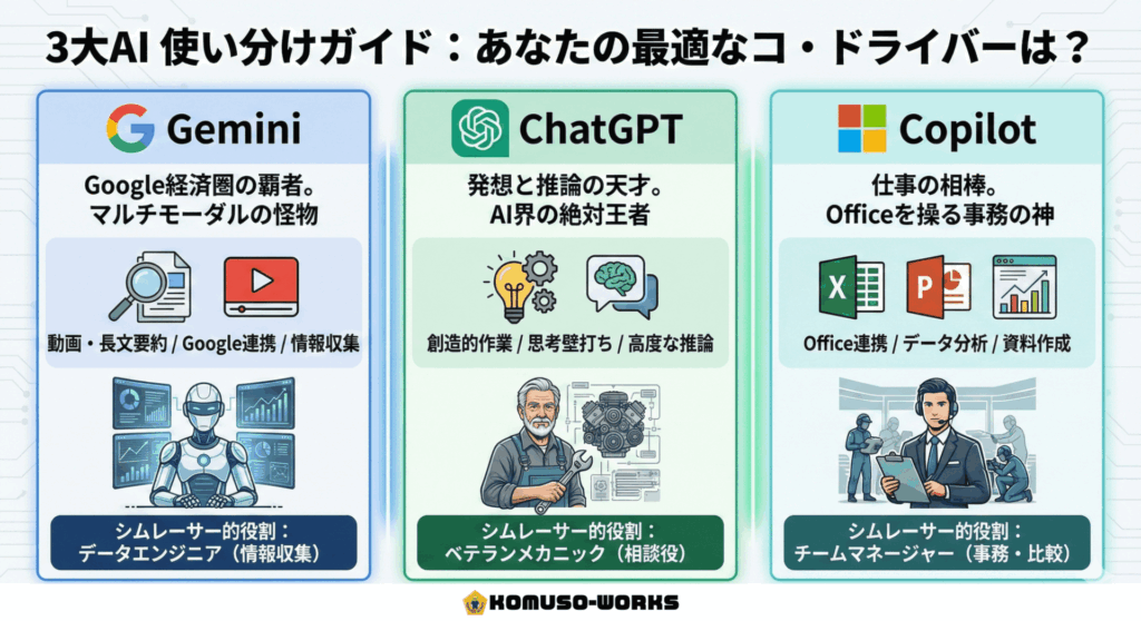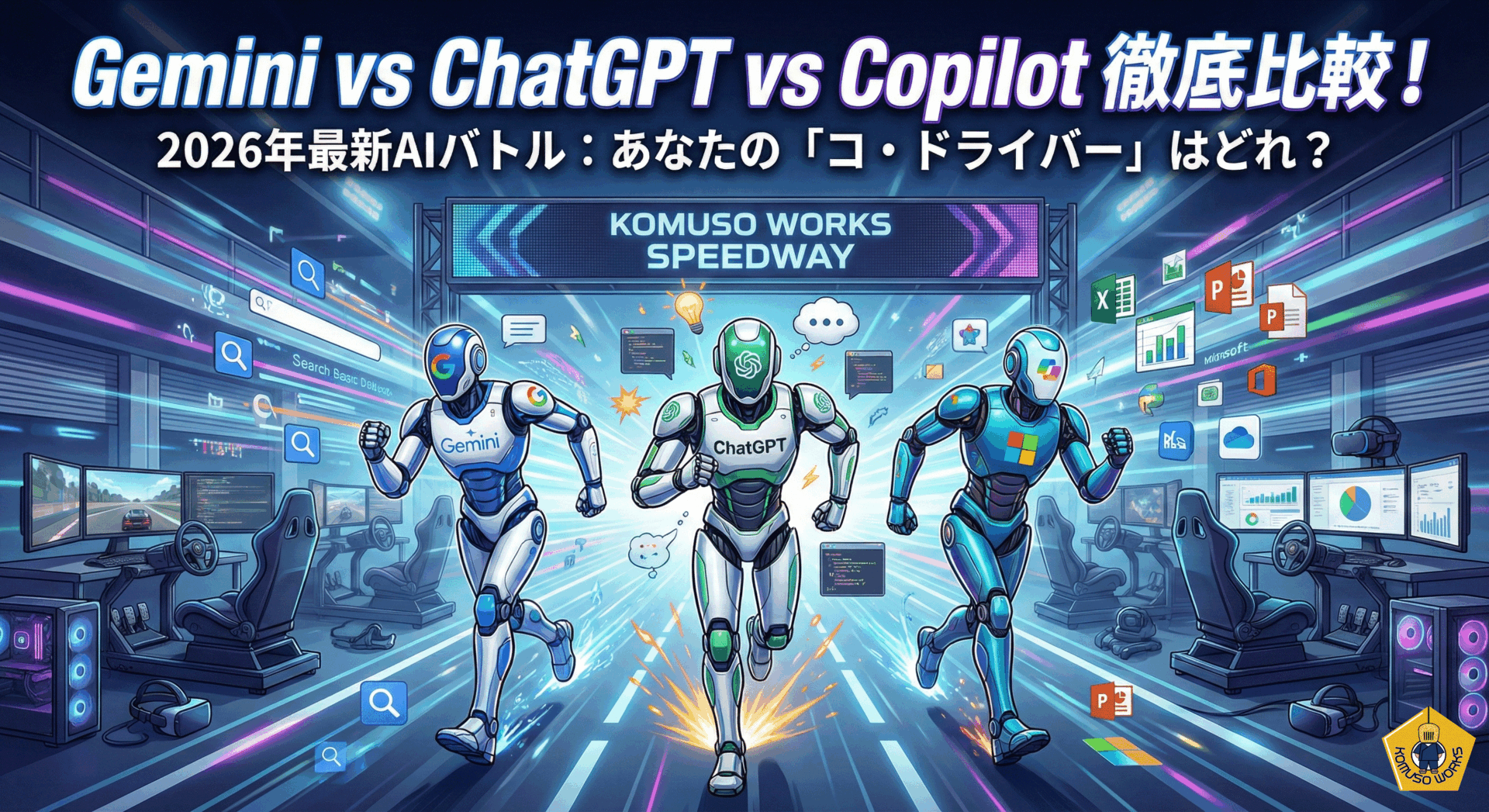 仕事に限らずSIMレースでも上手く利用できれば、AIがただのチャットボットから「専属メカニック兼パーツアドバイザー兼コ・ドライバー」に生まれ変わるんじゃないか?そんな気持ちから、今回はGoogleの「Gemini」・OpenAIの「ChatGPT」・Microsoftの「Copilot」の仕事でもプライベートでも使う機会が多くなってきたであろう最新3大AIについて、2026年時点での私の視点でガッツリ比較し、それぞれの「得意・不得意」や「課金の価値」、そしてSIMレーサーとしての活用術まで書いてみました。