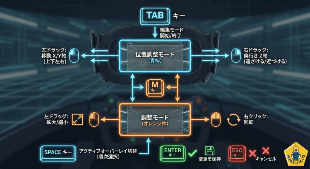 VR内でオーバーレイの位置やサイズを調整する「編集モード(位置調整モード)」の操作図です。
