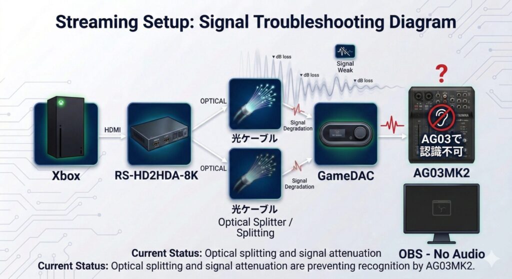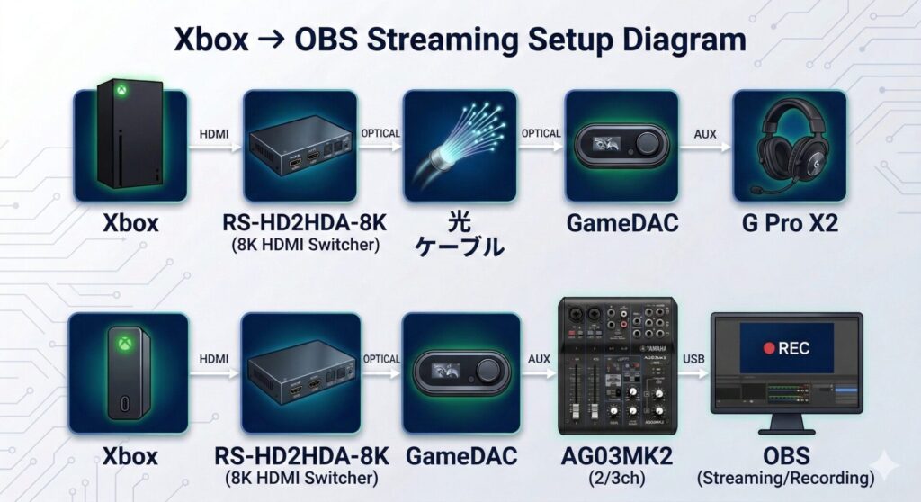 Xbox▶RS-HD2HDA-8K(分配器)▶光ケーブル▶GameDAC という構成から